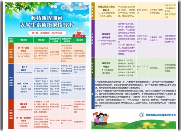 大学生素质拓展作为武汉职院各专业(群)人才培养方案的重要组成部分和学生学习成长的重要载体,在防疫特殊时期也不能停止和断档。2月16日,新学期开学在即,校团委大学生素质拓展中心面向全校学生发布了《疫情防控期间的大学生素质拓展指导卡》,第一期指导卡共六个模块,分为“防疫精神学起来、一本好书读起来、备战挑战杯忙起来、强身健体动起来、防疫志愿服务做起来、热爱生活家乡歌曲唱起来、寒假收获分享起来、家务劳动干起来”八项活动课程,引导和鼓励广大学生在确保符合所在地疫情防控要求、自身健康和安全有保障的前提下自主选择参与。学生参与情况将依照《武汉职业技术学院学生素质拓展学分管理办法》,开展过程管理和素质拓展学分认定。