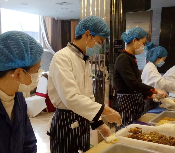 何成丰和后勤保障团队为抗疫一线工作人员配备盒饭