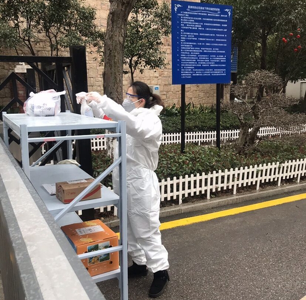 酒店管理党支部书记孙嫘老师在兼顾教学的情况下,担任小区楼栋志愿者分拣配送物资,照顾80多岁高龄的独居老人,时常从自家为老人送去所缺物资。
