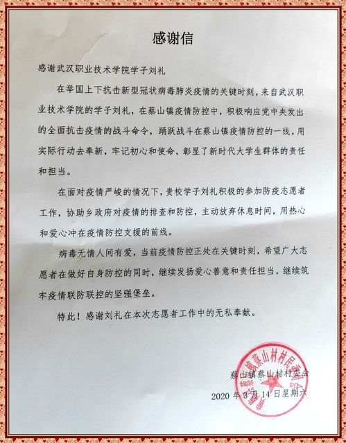 汽营18301班学生刘礼在春节期间得知蔡山村因返乡人数众多且防控人员人手短缺的严峻形势下,主动请缨,迅速投入到当地的疫情防控志愿服务。精通办公软件的他,积极承担着线上防控工作,通过建立全村微信群,统计汇总村民基本信息,实时掌握体温数据,主动关心关爱村民的身心健康,做好心理疏导,及时发布国家应对疫情所作出的相关部署和最新形势发展,避免村民恐慌并劝导村民不信谣、不传谣,以“一对多”的服务方式为村民排忧解难。“不掉线”的他为当地的防控工作织密起了一张线上“安全网”。黄冈市黄梅县蔡山镇蔡山村村委会发来感谢信:“面对严峻的疫情形势,贵校学子刘礼主动牺牲休息时间,积极参加防疫志愿者工作,协助乡政府开展网格式排查,用热心和爱心筑牢了我村疫情联防联控的坚强堡垒。”