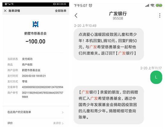 图左:李洁为鹤壁市慈善总会捐款 图右:梅雨为因疫致困儿童捐款