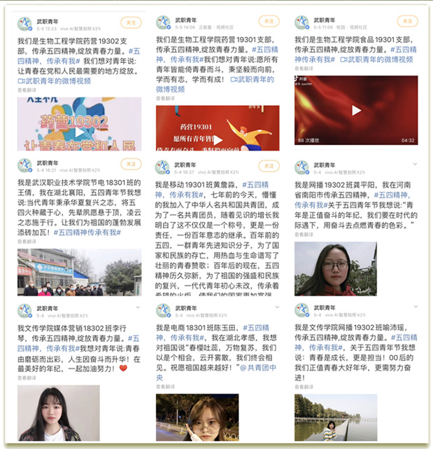 据悉,在2020年“五四”前后,武汉职业技术学院团委结合实际,在线上线下集中开展了理论学习、政策宣讲、典型选树、故事分享、志愿服务、岗位建功、关爱帮扶等活动,在全校团员青年中形成了传承五四精神、共话青春责任的热潮。