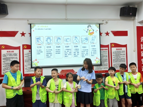 医学24301班漆文娟为孩子们带来了生理卫生健康科普:“我们生病时身体里的免疫系统可是跟细菌进行着一场大战哦,小朋友们要配合治疗,才能消灭‘敌人’!”她还教授了七步洗手法,强调良好的日常卫生习惯对身体健康的重要性。