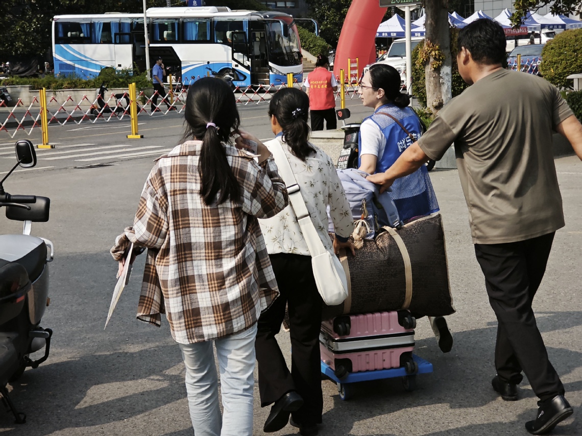 “同学,你的宿舍在东十C栋对吗?”看到新生小李拖着两大箱鼓囊囊的行李,额角沁出细汗,王福铭老师立刻快步上前,伸手接过行李箱:“我知道路,我带你过去!”