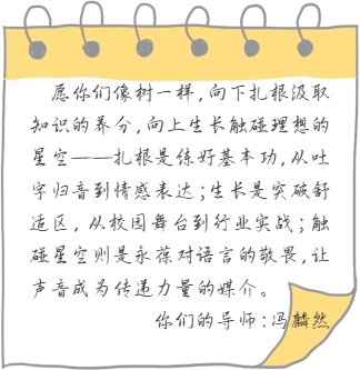 播音主持专业冯麟然老师,则在信中写下对新生的期许:“愿你们像树一样,向下扎根汲取知识的养分,向上生长触碰理想的星空——扎根是练好基本功,从吐字归音到情感表达;生长是突破舒适区,从校园舞台到行业实战;触碰星空则是永葆对语言的敬畏,让声音成为传递力量的媒介。这里的每一寸土地,都会见证你们的成长。”