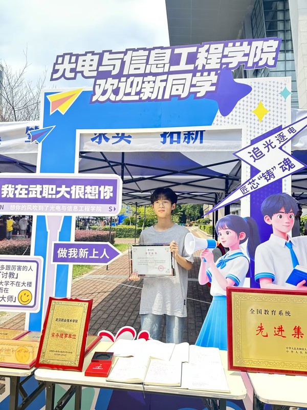 为留存这份珍贵的初遇记忆,光电与信息工程学院特别打造了“追光逐电”主题打卡小屋。新生们手持“追光逐电·匠‘芯’铸魂”“追‘光’不止· ‘电’亮青春”等创意手牌,在背景框前留下了属于自己的大学第一张合影。