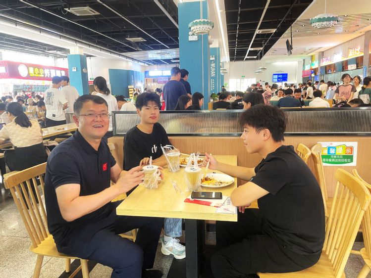 中午12时许,食堂正值午餐高峰,师生在各窗口前有序排队。何保华坐到正在就餐的学生餐桌旁,笑着问道:“同学们觉得食堂饭菜口味怎么样?价格能接受吗?”一名新生轻声回应:“食堂饭菜种类特别多,味道也不错,我午餐费一般是8元到10元,很实惠。”坐在旁边的同学补充道:“这里有南方的汤粉、北方的面食,还有各地特色小吃,能满足我们不同的口味需求。”校长爽朗的笑声、亲切的话语,让新生们渐渐放松,大家纷纷打开话匣分享入学以来遇到的新鲜事,现场氛围热烈又温馨。
