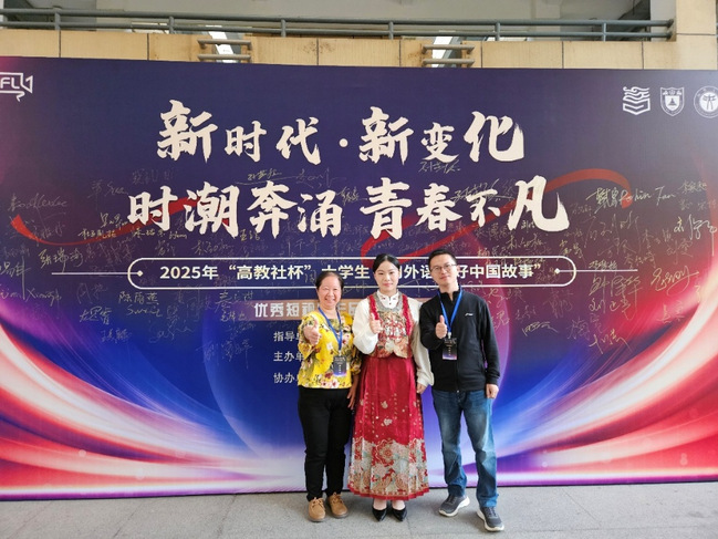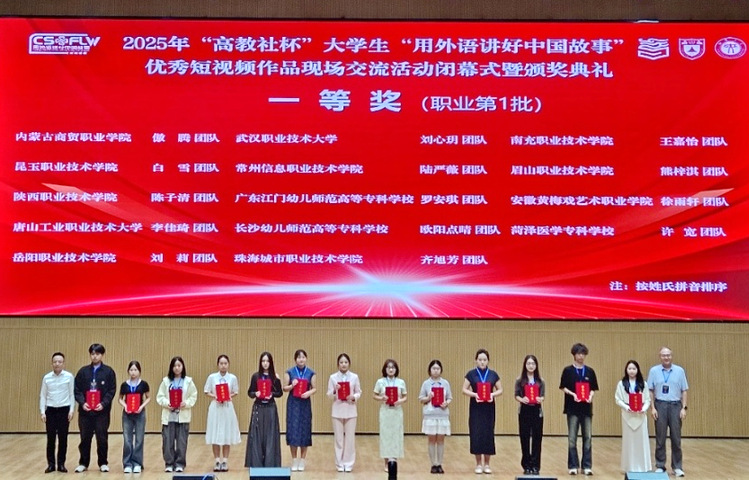 新闻网讯(通讯员吴娅敏)9月21日,2025年“高教社杯”大学生“用外语讲好中国故事”优秀短视频作品现场交流活动结果揭晓,足球直播外语外贸学院团队作品《Han Threads Renewed(汉绣新章)》荣获职业院校组全国一等奖,学校获“优秀组织单位”奖,指导教师汪洋获评“优秀指导教师”。
