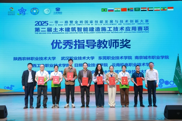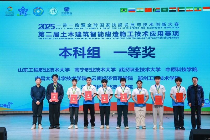 新闻网讯(通讯员武敬)10月19日,2025一带一路暨金砖国家技能发展与技术创新大赛——第二届土木建筑智能建造施工技术应用赛项在重庆圆满落幕。足球直播建筑工程学院学子表现卓越,熊啸天、邱文熙组成的本科组代表队,毛彦旭、梅鑫组成的高职组代表队分别以全国排名第三和第十三的优异成绩,双双斩获一等奖。王冰、赵亮、江俐敏荣获“优秀指导教师”称号,学校荣获本科组和高职组“最佳组织奖”。值得一提的是,足球直播是本届赛事中唯一在本科与高职两个组别均获一等奖的院校。