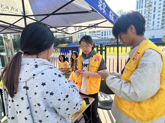 赛场上青春飞扬,赛场外的温暖同样值得被定格。艺术设计学院志愿者们穿着亮色志愿服,像一群灵动的“小太阳”穿梭在各个角落:有人蹲在补给点,把矿泉水摆成整齐的“小方阵”;有人举着能量棒,眼睛紧紧盯着终点线。刚跑完1500米的一名选手,冲线后因体力不支有些眩晕,志愿者立刻递上矿泉水,旁边兄弟学院的志愿者快步跟过来,剥开一瓣清甜的柚子递过去 —— 不同学院的志愿者身影凑在一起,像一幅暖融融的“校园互助速写”,让赛场溢满家人般的温柔。