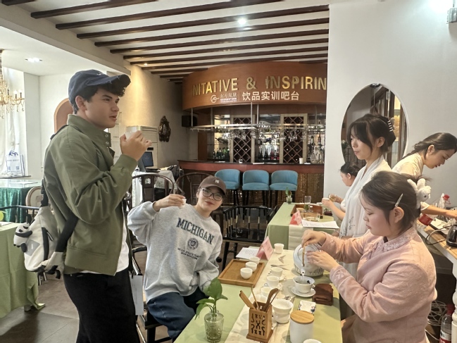 最令人期待的“六大茶类品鉴”环节在茶香弥漫中展开。活动设置了对应不同茶类的六个茶席,茶艺师现场冲泡,留学生们穿梭于各茶席之间,细细品味每一道茶的独特韵味。品鉴后的问卷调查显示,香气馥郁、韵味悠长的大红袍(属乌龙茶类)最受青睐,文如双笑着说:“一闻就被它的香气迷住了。”李正则对红茶情有独钟:“红茶不仅味道好,它的健康功效更让我心动。”