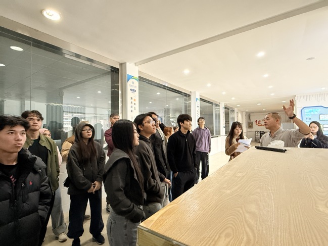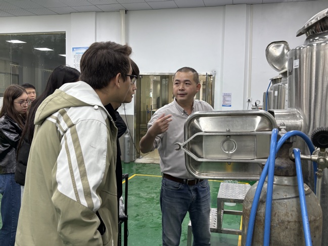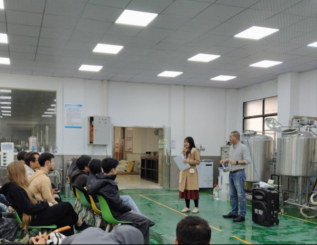 在啤酒酿造流程图前,留学生们围拢聆听杨才逐环节解析制麦、研磨、糖化、煮沸、发酵等关键工艺。针对留学生提出的技术疑问,杨才结合实操要点逐一回应,重点强调温度控制与卫生规范的核心作用,将复杂专业知识讲解得通俗易懂。