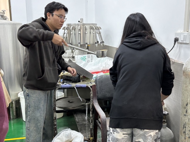 进入实践环节,留学生们在杨才的指导下,轮流操作磨麦芽机器,亲身感受原料加工过程。赵林叶力和来自哈萨克斯坦的朱芝主动承担整袋麦芽的磨制任务,配合默契高效,赢得现场一致称赞。哈萨克斯坦留学生雷佳品尝磨好的麦芽后赞叹:“香气浓郁,带着自然的谷物甜味。”