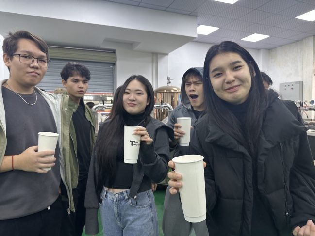 在令人期待的品鉴环节,留学生们纷纷品尝生物工程学院学生自酿的啤酒,并踊跃分享感受。来自哈萨克斯坦的月华点赞道:“味道轻柔、酒精度适中,特别适合分享饮用。”朱芝对比家乡啤酒说道:“家乡啤酒口感清爽、气泡足,像冰镇汽水;这款精酿麦香突出,还有坚果回甘。” 柬埔寨留学生蔡天龙则称:“平时喝的清爽型啤酒入口偏淡,这款精酿麦芽厚重感十足,还带着淡淡果香,味道更扎实。”此外,李正分享了家乡以黑面包为原料的无酒精饮品,并请教其与大麦啤酒的工艺差异,引发一场生动的跨文化饮食交流。