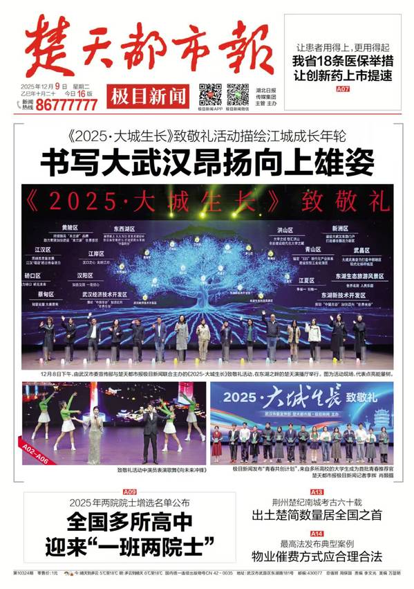 新闻网讯(党委宣传部陈峰)12月8日下午,由武汉市委宣传部与楚天都市报・极目新闻联合主办的《2025・大城生长》致敬礼活动在湖北日报传媒集团楚天演播厅盛大举行。