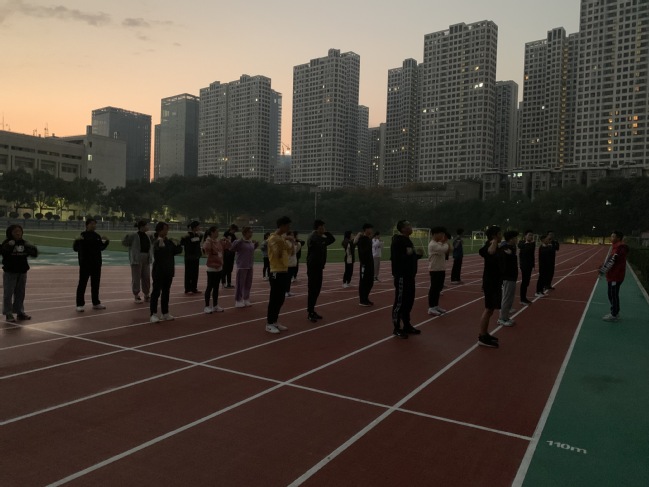 “宿舍早上几点开门啊!”“6:30,大家订好闹钟,6:00起床,开门了就直接跑步至形体房,训练到7:30再去吃饭。”“大家时间抓紧点,再来两遍,10:15结束,10:30宿舍锁门,大家跑步回去!”这些对话,是运动会开幕式上啦啦操队员们的日常缩影。