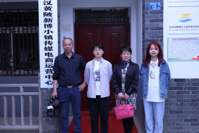 陆娟(左二)与指导老师和合伙人在新博小镇传媒电商运营中心合影