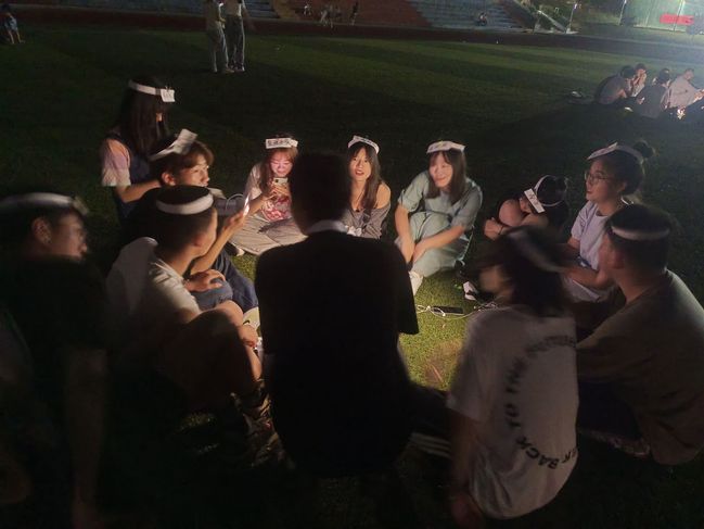 操场上,郭航老师带着旅游管理专业新生共话中秋,为了让同学们尽快相互熟悉,冲淡想家的伤感,郭航老师组织大家唱红歌、同赏月,分享成长趣事,大家很快就熟络起来。