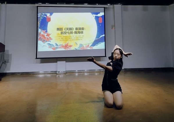 旅管21301班罗遂翔、林伟鑫、廖巍敬、毕浩、杨光、范骁义齐声吟唱《水调歌头》;陈雨馨通过一段跳舞将气氛推到了高点,同学们欢呼着一起参与其中。
