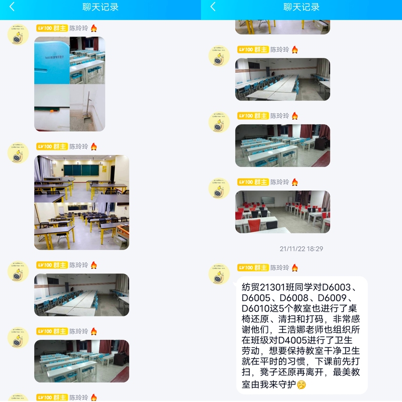 纺织与服装工程学院维护教学环境时,有整理桌椅、打扫卫生的任务。一接到通知,纺贸21301班就来了十几名学生,经过三个小时的劳动,教室面貌焕然一新。办公室主任陈玲玲陈玲玲连连称赞:“这个班的同学真不一样。”还有一次,学生办公室主任徐芳芝整理资料表格时间非常紧,原本想找两个同学帮忙,结果班上一下来了十几个同学,大家用两个小时就完成了整理任务,徐芳芝说:“这个班级的同学真给力。”纺贸21301班的同学们乐于助人、一呼百应,被老师们赞誉为“小太阳”。
