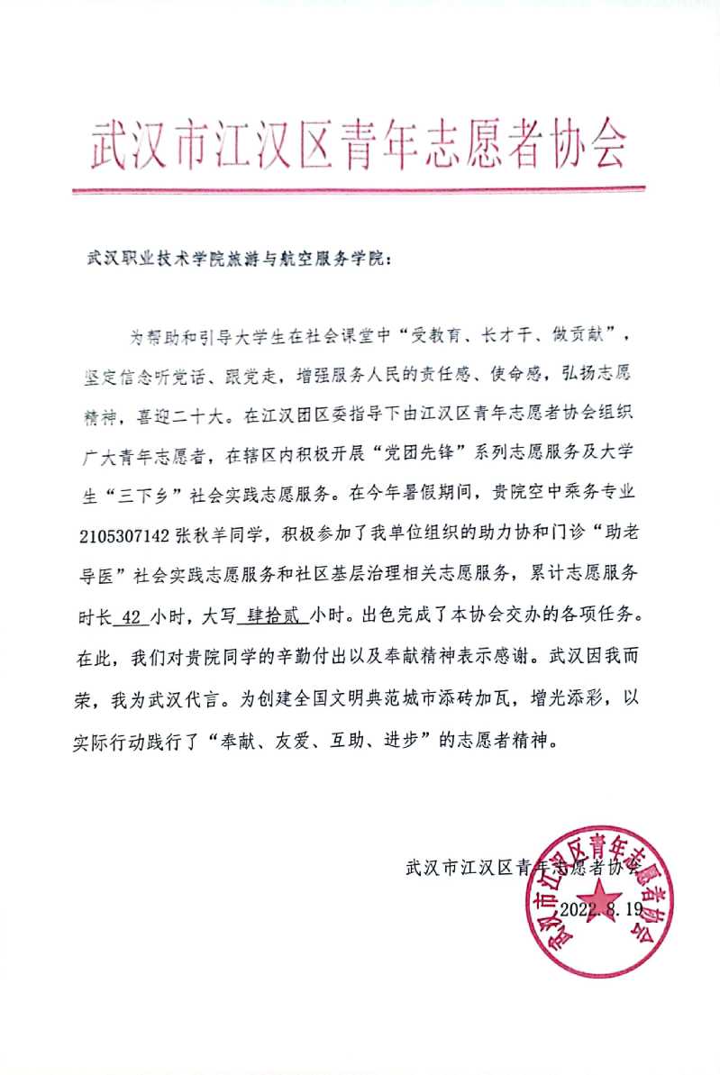 在这个百年来最热的夏季里,在“四大火炉”之一的武汉,张秋羊不畏酷暑,坚守岗位,任劳任怨,乐于奉献,累计志愿服务时长达42小时,出色地完成了武汉市江汉区青年志愿者协会交办的各项任务,得到协会的嘉许和社会各方的好评。8月19日,江汉区青年志愿者协会专门给旅游与航空服务学院发来感谢信。