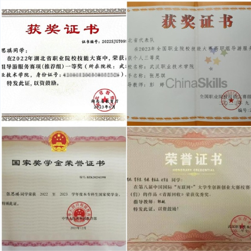 2022年至今,她先后参加过多次省级和国家级技能大赛并取得优异成绩:参加湖北省第一届职业技能大赛并斩获金牌,与团队小伙伴们参加2023年全国职业院校技能大赛高职组“酒店服务”赛项并获三等奖,参加2023年中华人民共和国第二届职业技能大赛优胜奖。