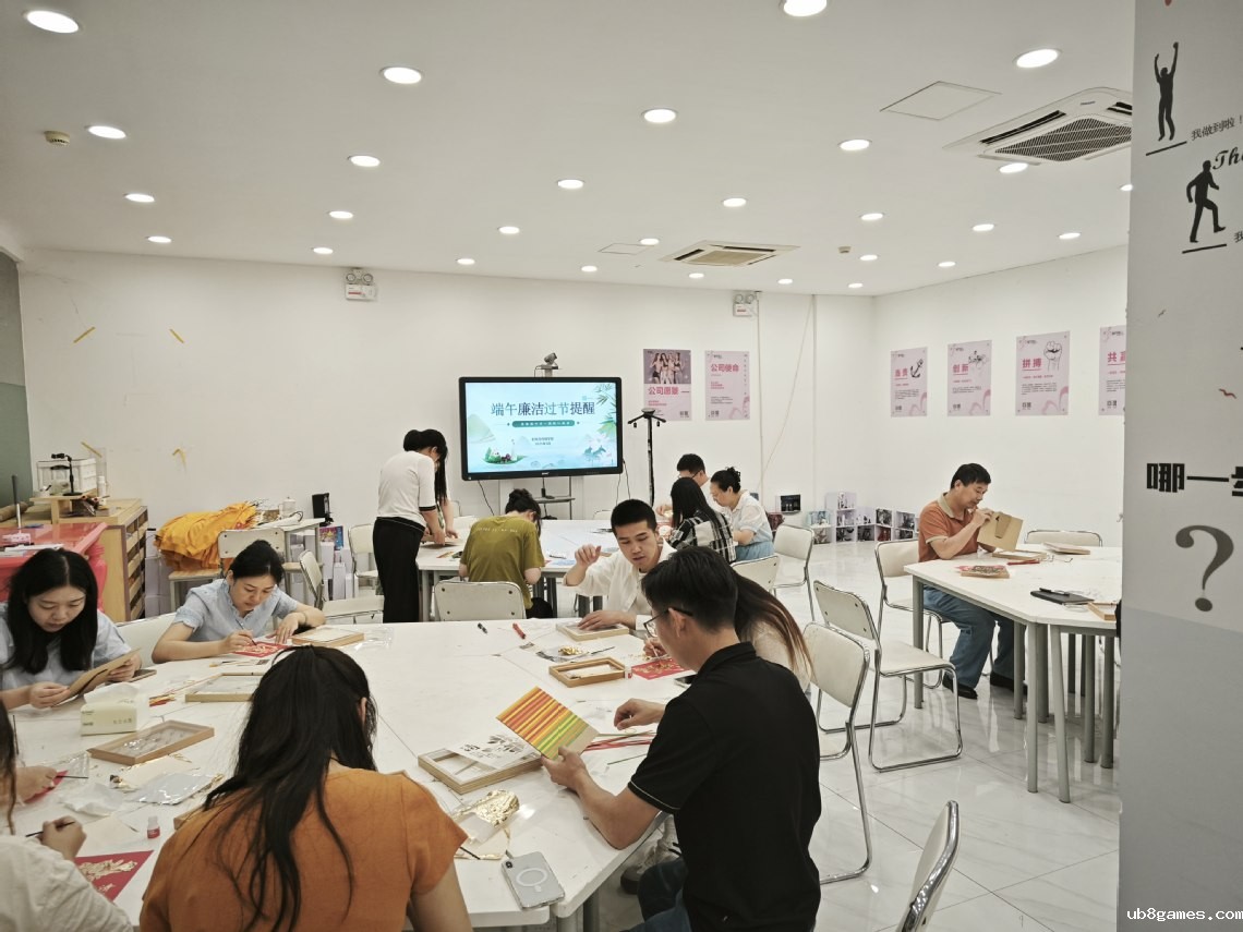 “竹编,讲究的是经纬交错、心手合一……”在“竹编画”活动区域,氛围热烈而温馨,老师们沉浸其中。只见他们手持细长竹篾,经纬交织,一拿一粘、一压一挑间,手法虽稍显生疏,但每个人都全神贯注,享受着竹编艺术创作的乐趣。不一会儿,勾勒出“一举高粽”“赛龙舟”等充满创意与温情的端午主题竹编画。